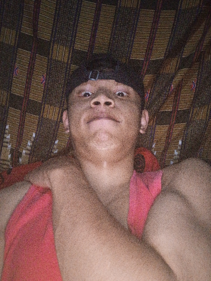 A man wearing a black baseball cap is positioned against a striped textile background. His head is tilted back, and he's looking directly at the camera with wide eyes. He's shirtless, but a red garment is draped over his shoulder. The shot is a close-up, capturing from the chest up, emphasizing the man's face and upper body. The image is somewhat grainy.