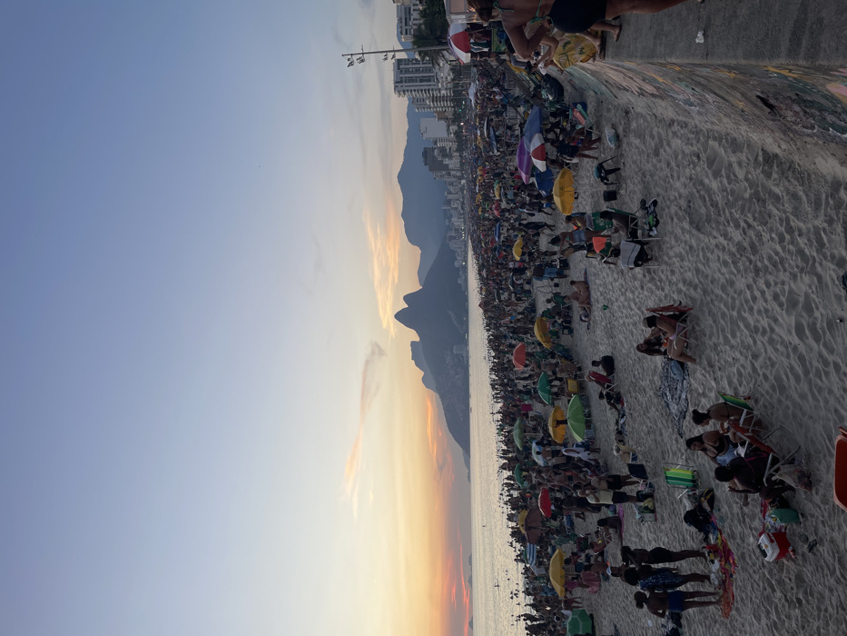 An expansive beach teeming with people stretches along the coast. Numerous colorful umbrellas dot the sandy landscape, and a line of buildings parallels the shore. A mountain range rises in the background, silhouetted against a sky illuminated by the setting sun. The light paints the sea with hues of orange and yellow. The scene captures a vibrant, busy atmosphere.