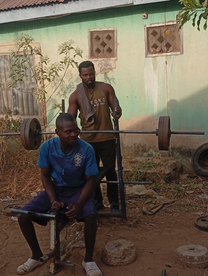 Two men are outside, working out with a barbell. One man, wearing a blue shirt, is seated on a bench, looking tired. The other man, wearing a tank top and a towel around his neck, is standing behind the bench, spotting him. They are in a yard with a simple, homemade-looking weightlifting setup. The surrounding area is a bit cluttered with tires and various objects. A building is in the background with square vents above a window.