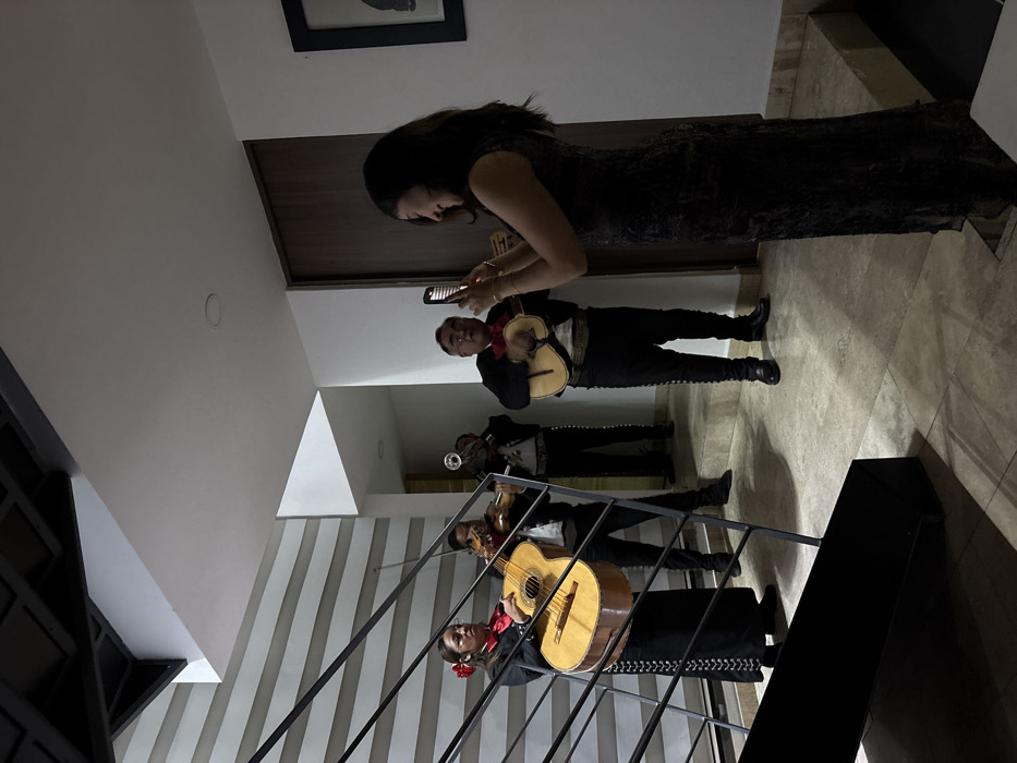 A woman in a long dress stands near the top of a staircase, facing a group of mariachi musicians