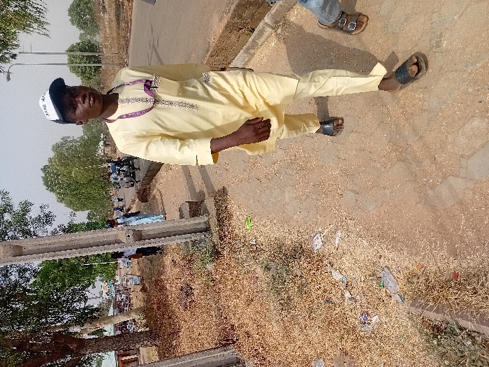The image depicts an outdoor daytime scene in Minna, Nigeria, featuring a young male walking on a dirt path beside an asphalt road