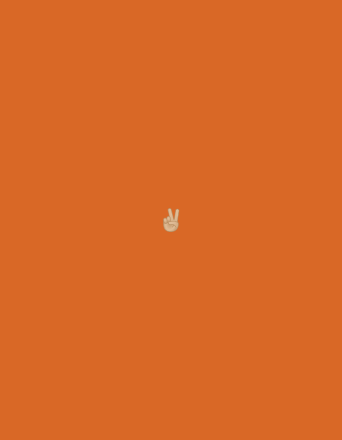 The scene, located in the city of Unknown, Unknown, consists of a uniform, solid orange background filling the entire frame. Centrally positioned is a small emoji depicting a light-skinned hand making a V-sign, commonly known as a peace gesture. No other subjects, objects, people, actions, interactions, or environmental details are present.