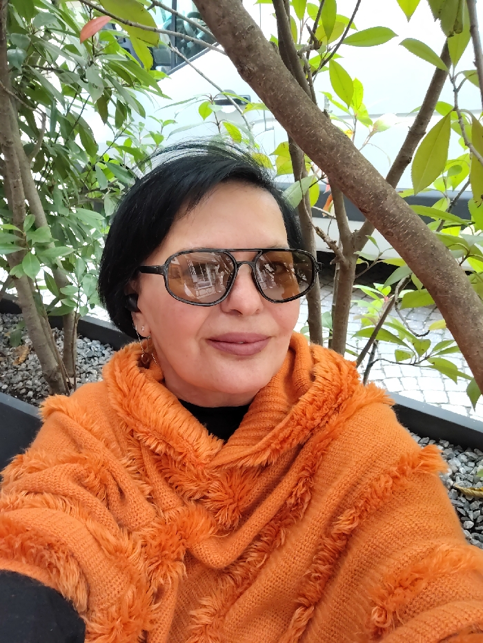 An image displays a woman in a close-up, outdoor portrait taken in Strasbourg, France. The woman has short, dark hair and is wearing dark-framed aviator-style sunglasses with tinted lenses, reflecting a light-colored vehicle or building. She wears a textured orange knitted poncho with fuzzy elements over a black garment. A small, light-colored earring is visible in her left ear, and a black earbud in her right ear. Her lips are adorned with light-colored lipstick. The background features green foliage from multiple small trees or shrubs. Behind the foliage, a white vehicle or structure is partially visible. To the right, a paved area with light-colored cobblestones can be seen, while to the left and below the foliage, a dark surface covered with small grey gravel or pebbles suggests a planter or outdoor seating area. The scene is illuminated by natural daylight.