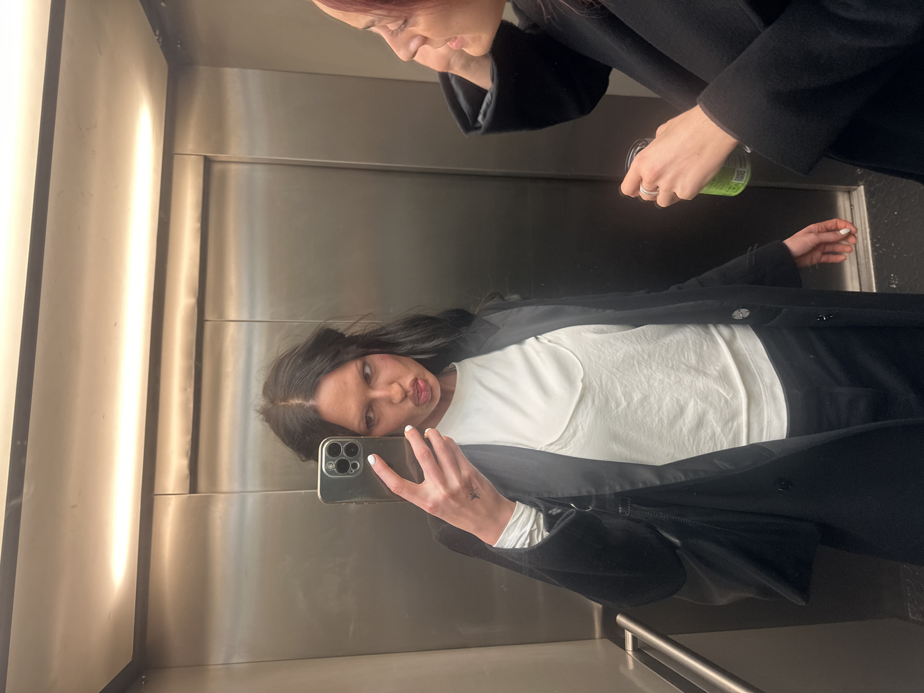 A reflection of a woman in a metallic elevator. She wears a white top under a black jacket and holds a smartphone up to take a photo. Another person is partially visible at the top right, holding a green can or bottle. The elevator walls are silver. A horizontal bar is visible in the lower right of the elevator.