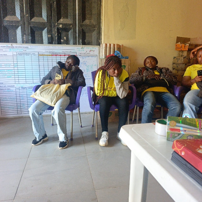 An interior scene in the city of Jos, Nigeria, shows four adult females seated on purple plastic chairs against a light yellow wall. To the far left, a large white board displaying a "PERFORMANCE REVIEW BOARD" and "WEEKLY KPI TRACKER" with handwritten text and grids is affixed to the wall. Behind the seated individuals, against the wall, are stacks of cylindrical objects and cardboard boxes. The leftmost individual wears a dark jacket over a yellow shirt, light blue jeans, and black and white sneakers. They hold a light-colored smartphone in their left hand, which rests on a yellow fabric bag on their lap. The second individual from the left has braided hair with reddish highlights, wears a yellow long-sleeved shirt and black pants, and rests their chin on their right hand. The third individual wears a dark brown and black leopard print jacket over a yellow shirt, blue jeans, and has their arms crossed over their chest. The fourth individual, partially visible on the far right, wears a yellow shirt and holds a black smartphone in their raised right hand. In the immediate foreground on the right, a white plastic table holds a roll of brown packing tape, a roll of white tape, a clear plastic container of "BIC" pens, and a stack of red-covered notebooks. The floor is light grey tiled. A dark, multi-paneled door or window structure is visible in the far left background.