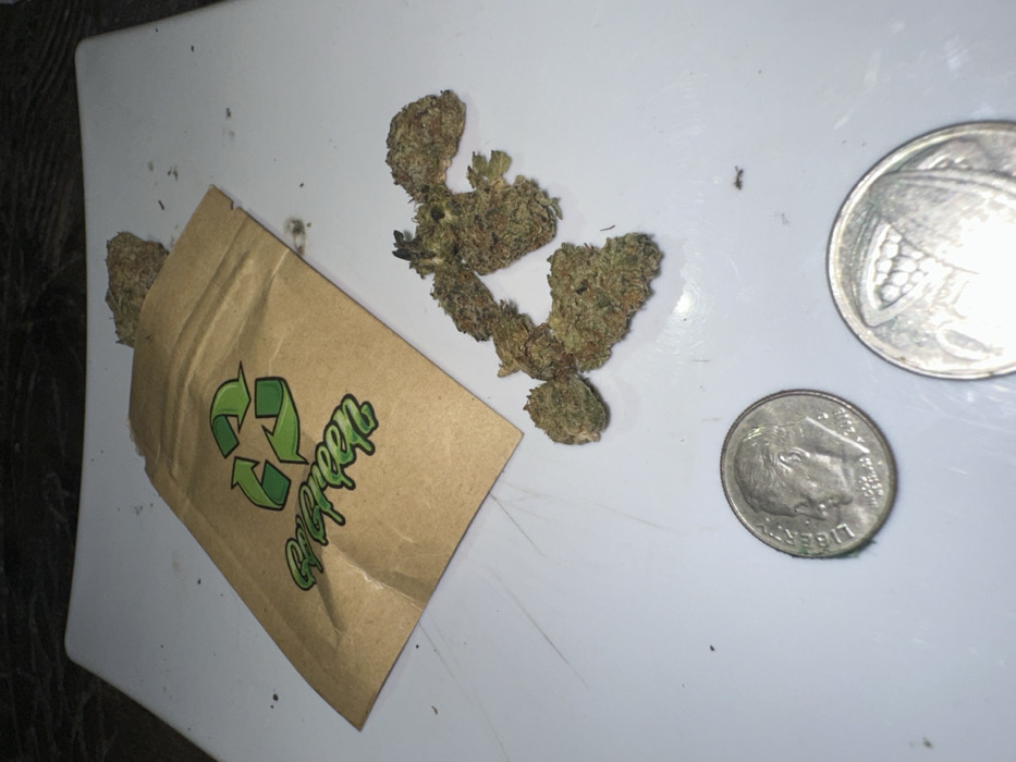 In Lugbe, Nigeria, a still-life image displays a collection of objects arranged on a white, flat surface, possibly a ceramic plate or tray. The primary subject is a quantity of dried, green and brown plant matter, consistent with cannabis buds, scattered across the right and central portions of the surface. A small, crumpled, light-brown paper pouch, approximately 7-8 cm in length, is situated in the upper-left, partially open. This pouch features a green recycling symbol and the word "Evergreen" printed in green script. Below the plant matter, two coins are visible. On the lower-left, a U.S. dime (10-cent coin) shows the profile of President Franklin D. Roosevelt and the year "2018." To its right, a second coin, partially cropped at the bottom, appears to be an Australian 20-cent coin, with a visible patterned surface on the reverse side. The background is dark and out of focus. No people are present, and no active actions or interactions are depicted. Small specks of debris and faint scratches are visible on the white surface.
