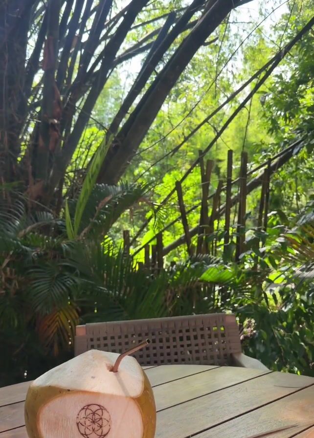 table with a fresh coconut drink, with “LUMEIRA” carved into the side of the coconut. The table is made of wood, and the coconut sits on a small wooden coaster. Behind the table is a woven chair, and beyond that is a lush, green scene full of bamboo and other tropical plants. The camera pans to the right. The sun is shining and the scene looks peaceful.