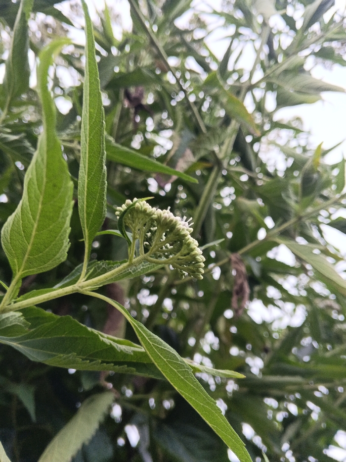 - "The image displays a close-up, upward-angled view of a plant branch featuring multiple green leaves and a developing cluster of white flower buds" by FM-vxrvI3, licensed under CC BY 4.0
