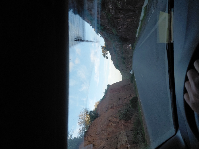The image depicts a driver's perspective from inside a vehicle traveling on a paved road through a mountainous or hilly landscape, located in the vicinity of Bni Yakhlef, Morocco. The foreground shows the dark dashboard and the top portion of a steering wheel, with a human right hand gripping it. The upper part of the windshield is obscured by a dark sun visor or headliner, and a vertical streak of dirt or damage is present on the upper right section of the windshield. A rectangular light-colored reflection is visible on the lower right of the dashboard. The two-lane asphalt road, devoid of immediate lane markings, curves gently to the right in the distance. Steep, reddish-brown rocky cliffs or hills flank both sides of the road, with sparse green vegetation, including bushes and trees, growing on their slopes. In the mid-distance on the right side of the road, a white vehicle (likely a car or small van) is visible, either parked or moving slowly. Near this vehicle, a yellow rectangular sign with indistinct black lettering/symbols is present, followed by a triangular road sign with a red border. The sky above the rock formations is light blue with scattered white clouds. The road appears to traverse a pass or valley between these geological features.
