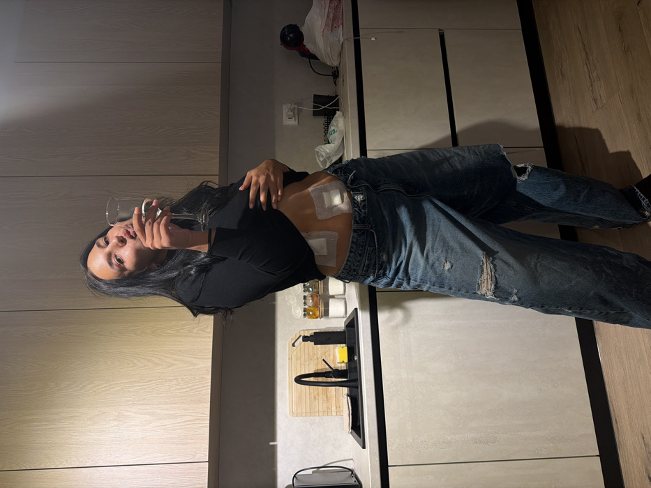 A female subject stands centrally in a modern kitchen in Sofia, Bulgaria, posing towards the camera. She has long, dark hair and is dressed in a black long-sleeved crop top and distressed, wide-leg blue jeans. Her midriff is exposed, revealing two rectangular white surgical dressings applied bilaterally to her lower abdomen. Her right hand holds a clear wine glass containing a transparent liquid near her pursed lips, while her left hand rests on her exposed abdomen. The kitchen features light wood upper cabinets and light gray lower cabinets with matching countertops. A black square sink with a black gooseneck faucet is visible on the left, accompanied by a wooden cutting board, a black soap dispenser, and a yellow sponge. On the countertop behind the sink are multiple small spice jars and two white storage containers. To the right, a white power outlet with a charger plugged in, a black hairdryer with a red attachment, and two plastic bags (one white, one red-patterned) are visible. The flooring is light wood. The space is illuminated by artificial light, casting some shadows.
