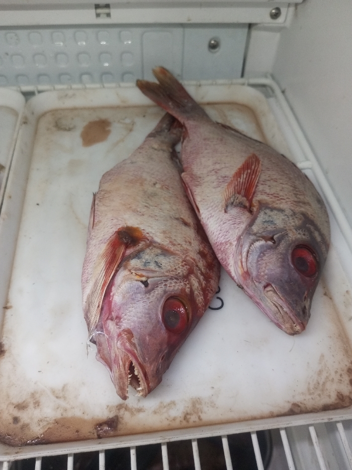 - "Two whole fish rest on a dirty white tray inside what appears to be a refrigerated display case" by FM-p7z193, licensed under CC BY 4.0