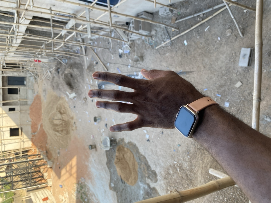 From an elevated perspective, a man's arm extends into the frame, a smartwatch with a brown strap adorning his wrist. His dark skin contrasts with the surrounding scenery. Below, a construction site teems with activity, scaffolding frames the partly finished building. Piles of sand and construction materials are scattered across the ground. The overall composition has a stark, industrial feel.