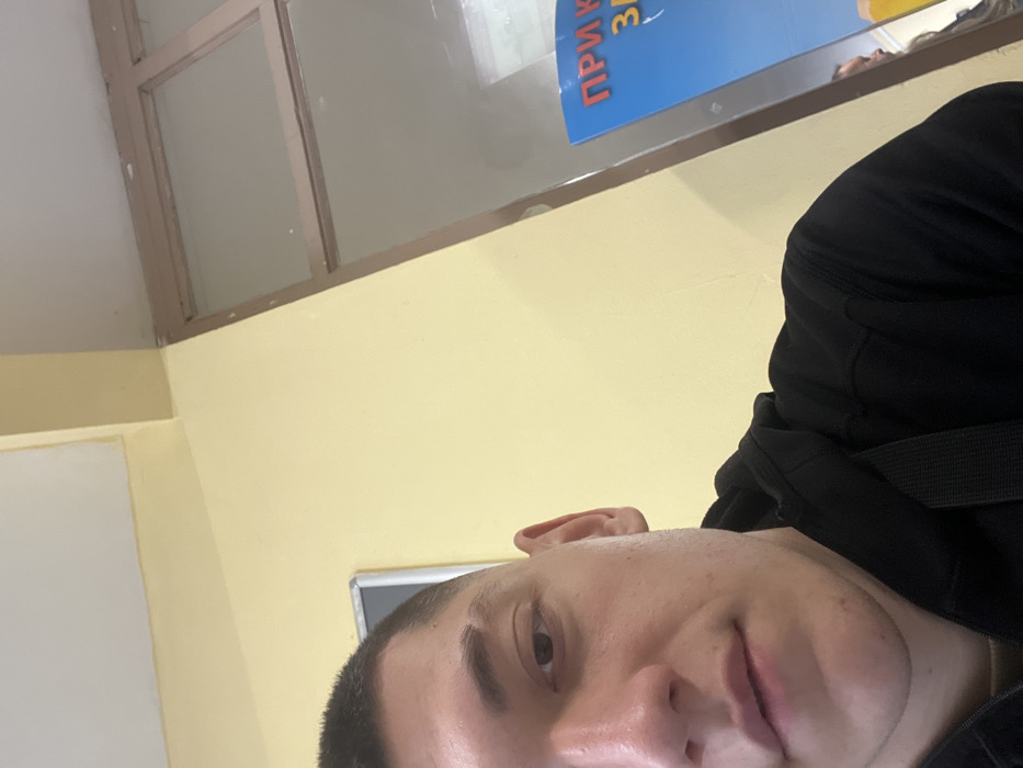 An upward-angled indoor selfie captures a young male on the left, partially cropped. He has a buzz cut hairstyle with a distinct slit shaved into his left eyebrow. He wears a black hoodie with visible stitching and a black strap, possibly from a bag, across his right shoulder. His gaze is directed towards the camera. The background consists of a light yellow wall on the left and center, meeting a white ceiling with a yellow trim at the top. A small, dark-framed object is partially visible on the yellow wall behind the subject's head. To the right, a glass partition with brown wooden frames is angled diagonally upwards. Through or reflected on this glass, a blue poster is visible, displaying Cyrillic text that begins "ПРИ К З" (PRI K Z). Below the blue section, an orange object is faintly visible, possibly a beverage. A blurred reflection of another individual, likely a male with short hair, is discernable through the glass or reflected on its surface, facing away from the camera's perspective. The setting suggests a casual public establishment, such as an eatery or cafe, located in Sofia, Bulgaria, indicated by the Cyrillic text on the poster.