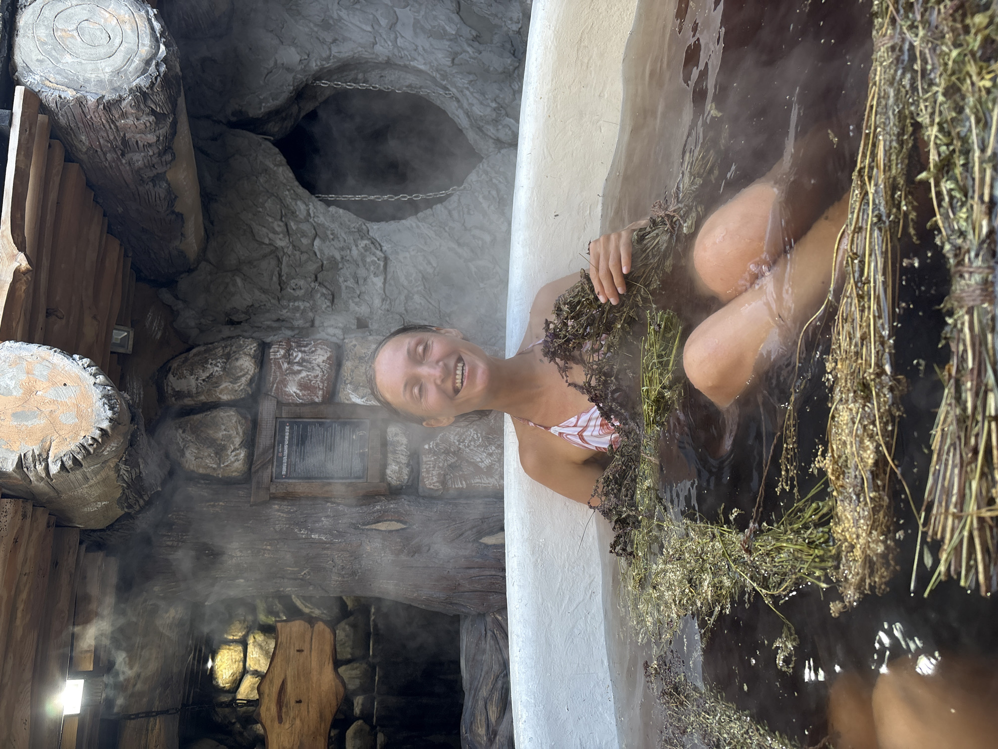 The image displays an adult female in a steaming, dark-colored herbal bath within a rustic, cave-like indoor facility located in Bely Klyuch, Russia