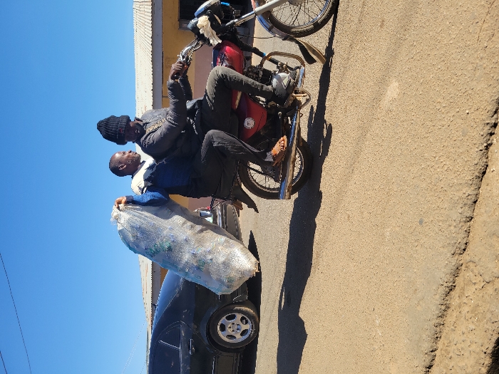The image displays two adult males on a red and silver motorcycle moving on a paved road under a clear blue sky. The setting is consistent with a street scene in Jos, Nigeria, although a specific location within the city cannot be precisely identified from the visual information. The driver, wearing a dark beanie, dark jacket, and dark trousers, is positioned in the front, operating the motorcycle. The passenger, seated behind the driver, wears a blue and white long-sleeved shirt and dark trousers, with brown sandals on his feet. He is carrying a large, translucent white sack, filled with numerous light-colored objects (likely plastic materials), draped over his left shoulder. A dark-colored sedan, partially visible on the left side of the frame, is behind and to the side of the motorcycle. The road surface is asphalt, showing some wear, and a raised curb is visible in the immediate foreground. Single-story buildings with light-colored walls and corrugated iron roofs are present in the background. The scene is brightly lit by direct sunlight, casting distinct shadows on the ground.