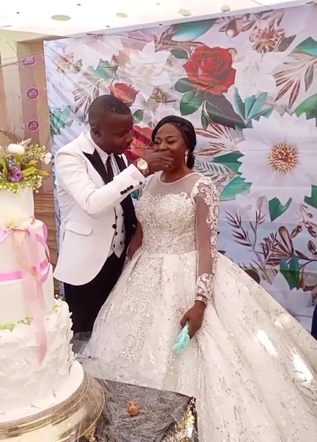 A wedding celebration is taking place. A bride wearing a white wedding dress with a long train and a groom in a white tuxedo stand beside a multi-tiered wedding cake. The groom feeds the bride a piece of cake. They are standing in front of a backdrop of floral prints. The scene appears joyous and celebratory.