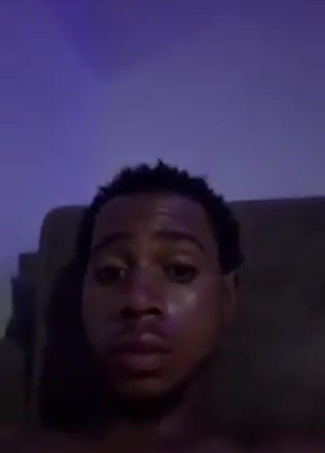 close-up of a young Black man's face. He is lying down, possibly on a couch, as the back of the furniture is slightly visible. The room is dimly lit with a blue-ish light. His hair is short and appears slightly damp. He looks directly at the camera with a somewhat serious expression. The video is a close shot focusing entirely on his face and upper chest area.