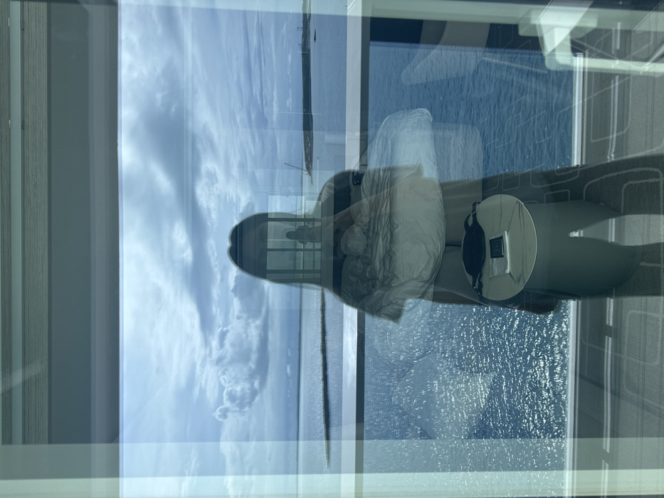The image displays a clear reflection of an individual within a large window overlooking an ocean view in the Berry Islands, Bahamas. The primary subject is a person with long, dark hair, reflected prominently in the foreground, largely silhouetted against the exterior light. This individual is holding a smartphone, discernible as a smaller reflection at chest height, indicating an act of photography or self-portraiture. They are attired in light-colored clothing, including a top and pants, and carry a circular, light-colored crossbody bag with a dark strap, which has a small, light-colored rectangular object placed on its surface. Through the window, an overcast sky with distinct cloud formations dominates the upper portion of the exterior scene. Below, a vast expanse of dark blue, rippling ocean water extends towards the horizon. In the mid-ground to the right, a distant, low-lying landmass or island is visible, featuring what appears to be a construction crane or similar vertical structure. A lighter horizontal line, possibly a sandbar or distant shoreline, separates different sections of the water. The internal environment's reflection includes a white horizontal window frame at the top and a patterned carpet or floor at the bottom of the frame.