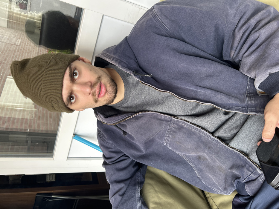 A young adult male, likely in his 20s or early 30s, is depicted in a chest-up portrait, situated in the city of Eindhoven, Netherlands. He wears an olive green knit beanie, a faded navy blue canvas-like jacket with a zippered front, partially open to reveal a grey crew-neck shirt. A small silver-colored stud is visible in his left earlobe. He has a trimmed mustache and goatee, and maintains direct eye contact with the camera, displaying a neutral expression with slightly parted lips. His right hand, positioned in the lower left, holds a dark-colored rectangular electronic device, possibly a smartphone. The background features a white window or door frame with glass panes; through the glass, a brick exterior wall is visible. To the left, wooden paneling or furniture is present, and a bright blue rod leans against the white frame.