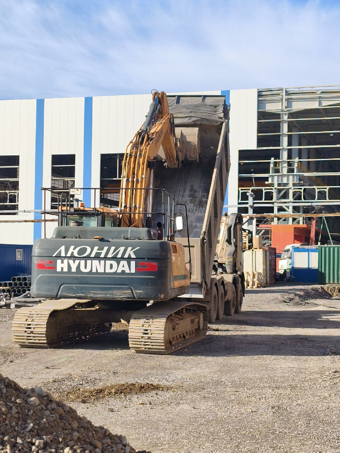 - "A Hyundai tracked excavator is observed from the rear-left, actively loading material into the raised bed of an articulated dump truck on a gravel construction site in Zlatitsa, Bulgaria" by FM-jE7Oj1, licensed under CC BY 4.0