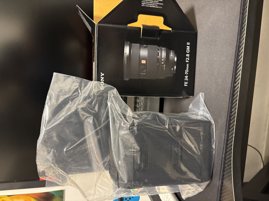 A Sony FE 24-70mm F2.8 GM II lens box is partially visible, displaying the lens image and product name. Next to the box, a black lens case is wrapped in clear plastic. The lens case appears to be padded and has a textured surface. The box and case are placed on a dark surface.