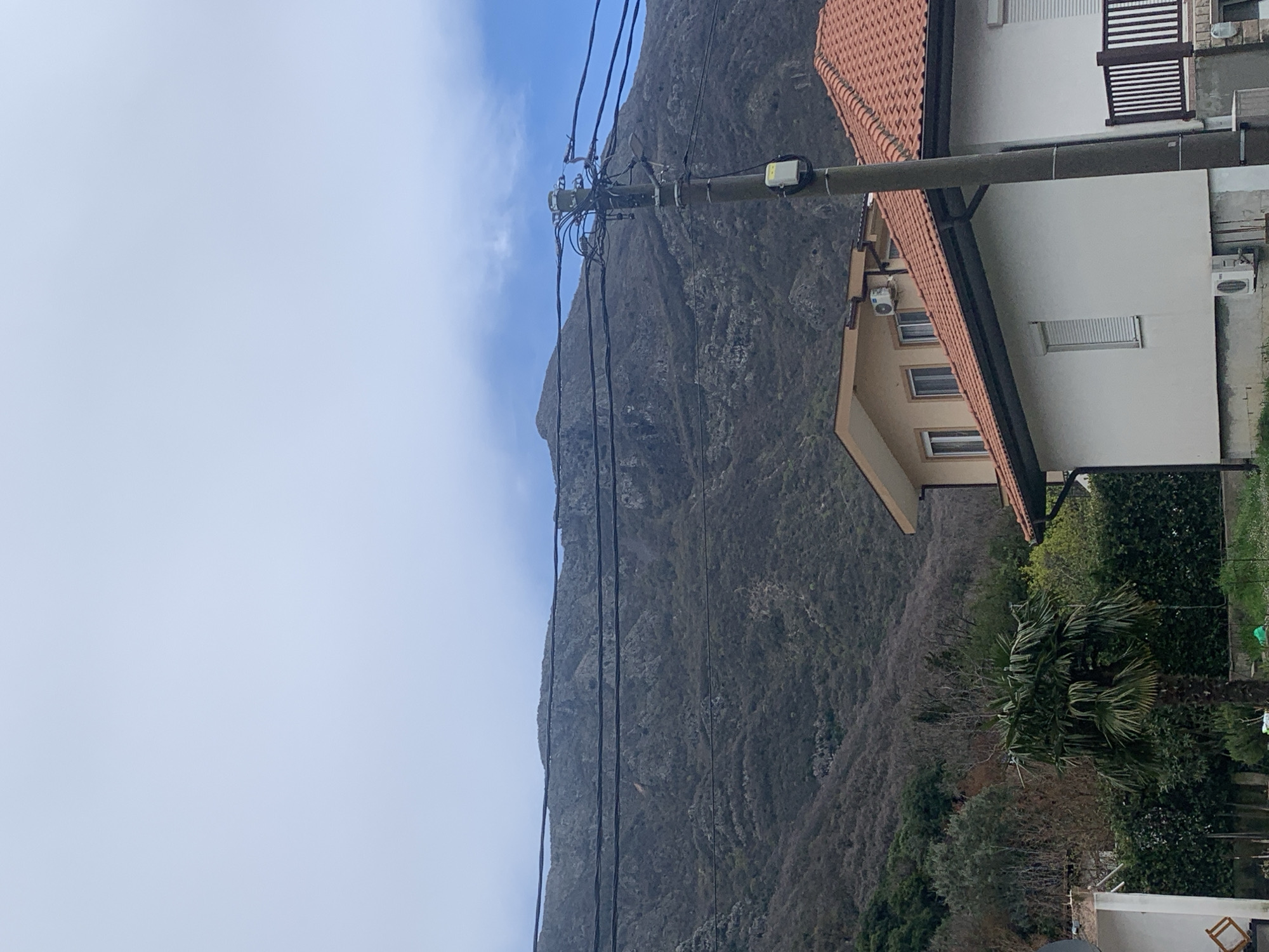 The image displays a residential street scene in Zagrađe, Montenegro, viewed from a slightly elevated perspective towards a mountainous backdrop under a partially cloudy, light blue-grey sky. A large, rugged mountain, characterized by grey-green rocky terrain and sparse, scrubby vegetation, dominates the upper half of the frame. Multiple black utility lines, strung horizontally, partially obscure the mountain range in the mid-ground. In the foreground and mid-ground, a prominent grey utility pole stands on the right, extending from the bottom of the frame and supporting numerous black electrical and communication cables. The pole is fitted with a street light fixture and a grey rectangular utility box. Two residential buildings are visible. The primary building in the lower right features white stucco walls and a terracotta-tiled roof. It includes a visible window with closed white louvered shutters and a balcony with dark vertical railings. A white exterior air conditioning unit is mounted on its lower wall. Behind and to the left of this structure, a second building with a light beige facade and a similar terracotta-tiled roof is partially visible, featuring multiple windows. Vegetation includes a prominent palm tree with dark green fronds in the lower-left quadrant, situated in front of a dense green hedge. Other trees and shrubs, some deciduous and bare, others evergreen, are scattered throughout the scene, particularly at the base of the mountain and around the buildings. No individuals or discernible actions are present.
