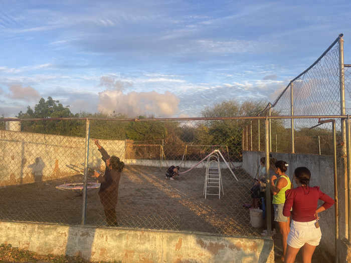 The scene depicts an outdoor, fenced enclosure in Altagracia, Venezuela, illuminated by late afternoon sunlight. The sky above is light blue with scattered cirrus and cumulus clouds, some tinged pink by the low sun. The enclosure is surrounded by a chain-link fence with metal posts, resting on a concrete base, and features a partially opened gate on the right. Beyond the fence, dense scrub vegetation and trees are visible. The ground within the enclosure is predominantly dry earth or sand. Visible equipment includes a white, A-frame stepladder standing centrally, and a partially disassembled or broken merry-go-round structure with a circular base and metal bars to its left. Further back, a frame consistent with a swing set is discernible. A person is observed lying prone or crouched on the ground near the merry-go-round. On the left side of the enclosure, a single individual, wearing dark long-sleeved attire, stands facing right, with their left arm raised and extended upwards, pointing or gesturing. Their shadow is cast prominently on the concrete base behind them. To the right, near the gate, three individuals are gathered. The closest, viewed from the back, is a female with dark hair, wearing a dark red top and white shorts, with her hands on her hips. Directly behind her, another female with dark hair, wearing a light green sleeveless top and light-colored shorts, observes the interior of the enclosure. A third, partially obscured individual in a light-colored top is also present, looking towards the enclosure's interior. A white bucket rests on the ground near this group. The overall scene shows multiple individuals present in a community space or playground.