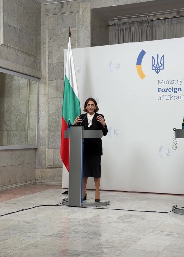A woman in a dark suit stands at a grey podium delivering a speech. Behind her is the flag of Bulgaria. The backdrop features the logo of the Ministry of Foreign Affairs of Ukraine. The setting appears to be an official press conference or political event. A chandelier is visible in the upper part of the frame. The woman gestures with her hands as she speaks, suggesting an engaging and formal tone.