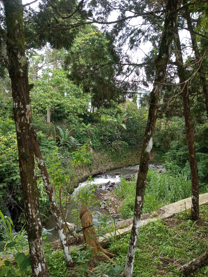 A tranquil scene unfolds with a creek cascading through a lush, verdant landscape. Trees with mottled bark frame the view, their branches overhead filtering the light. Dense vegetation lines the creek banks, contrasting with the water's movement. A concrete walkway traces the edge, suggesting human intervention within this natural setting. In the distance, a white building peeks through the foliage.