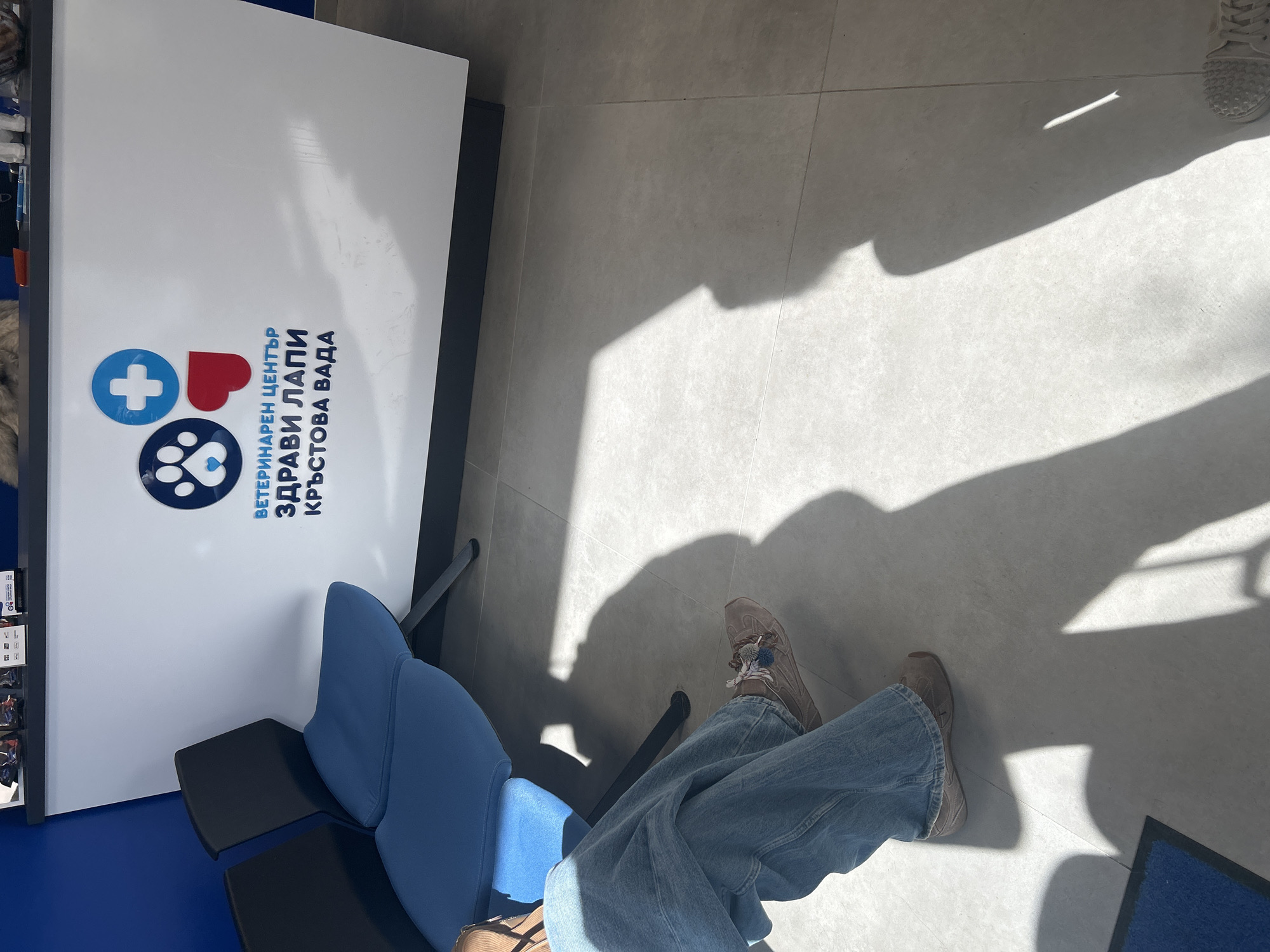 The image is taken from an elevated perspective, showing a person sitting in a waiting area of the Veterinary Center Healthy Paws Krastova Vada, a veterinary clinic in Sofia, Bulgaria. The person is wearing jeans and taupe-colored sneakers. The waiting area has a blue and black chair. A sign for the veterinary center is visible, featuring a blue cross, a red heart, and paw prints. Bright sunlight casts shadows across the tiled floor. The overall setting suggests a clean, modern veterinary clinic.