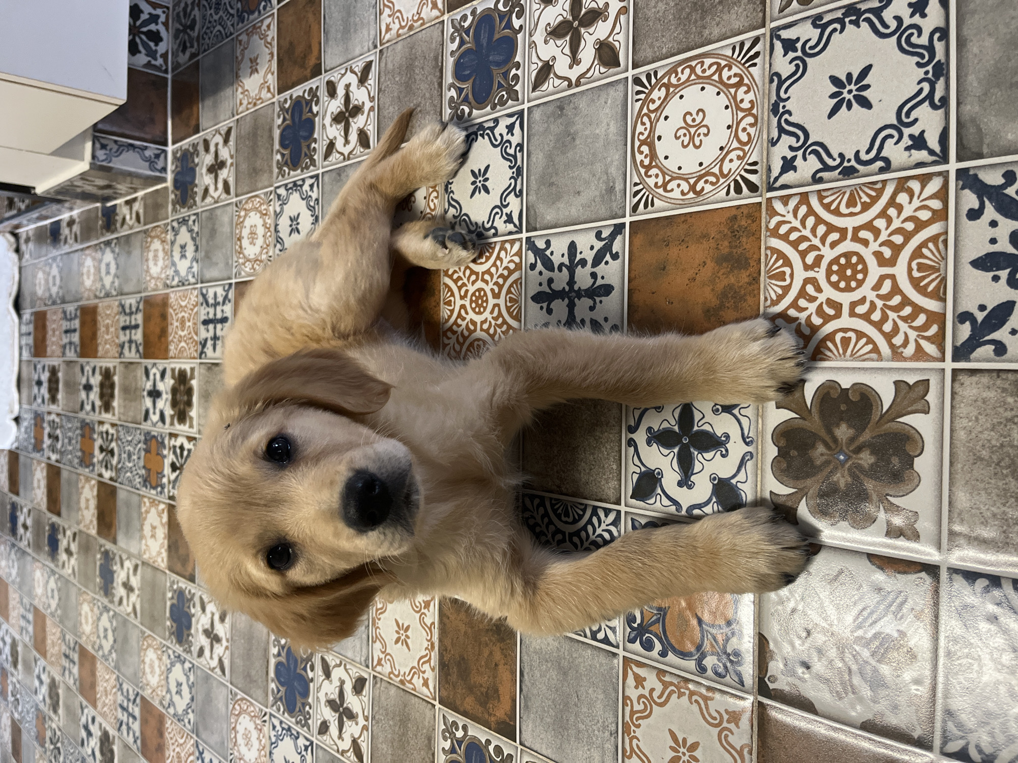 - "A light golden-furred puppy, identified as a Golden Retriever, is positioned centrally on an indoor tiled floor, facing directly towards the viewer" by FM-lpmjW2, licensed under CC BY 4.0