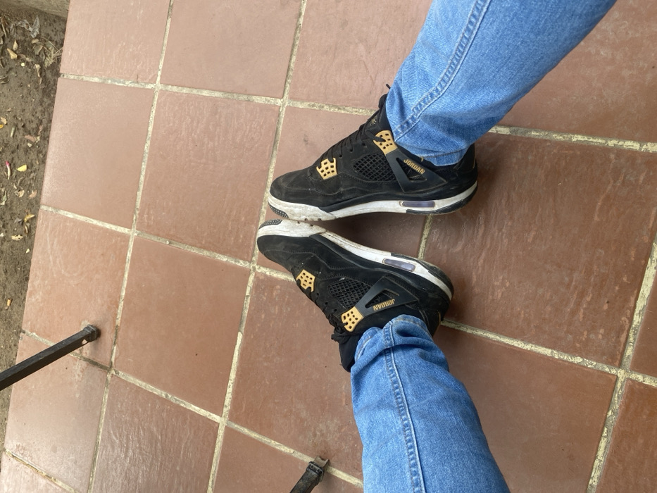 - "A person wearing light-wash blue jeans and black and gold Jordan 4 sneakers stands on a brown tiled surface" by FM-SP1IA3, licensed under CC BY 4.0