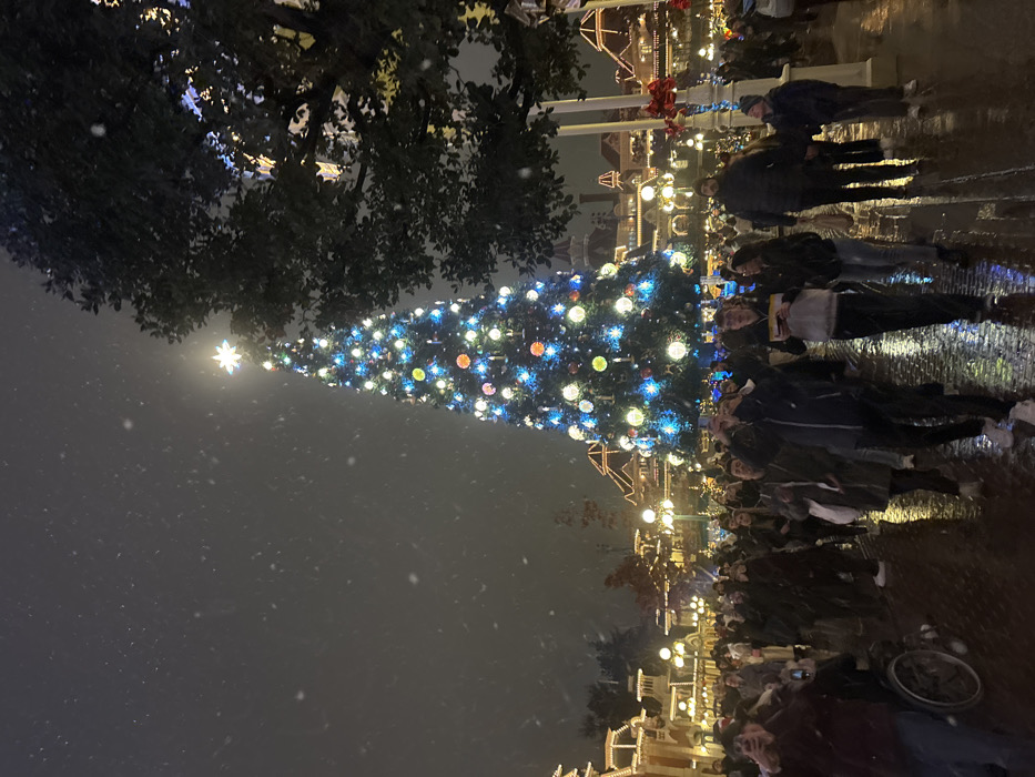 A tall, illuminated Christmas tree stands prominently with people gathering around