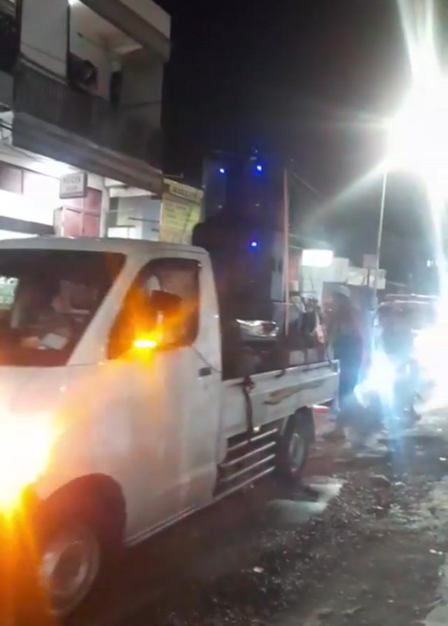 The video is shot at night on a street in what appears to be a town or city. The lighting is primarily from streetlights and vehicle headlights, which create bright spots. The road surface is uneven with patches of gravel or debris. **Objects:** * A white pickup truck is parked on the side of the road. The truck's headlights are on. The bed of the truck is carrying a large sound system, consisting of stacked speaker cabinets. Some of the speakers have blue lights. * Motorcycles are present, with multiple people riding them. * A police car with flashing red and blue lights is visible in the background. * Buildings line the street, with visible storefronts. * A sign is visible above one of the storefronts, possibly advertising a business. **People:** * There are multiple people visible, including those riding the motorcycles and those standing on the side of the road. The faces are not clearly visible. **Actions:** * The motorcycles appear to be moving slowly or stopped near the pickup truck. * The sound system is playing loud music. **Interactions:** The people seem to be congregating or interacting around the pickup truck with the sound system. The presence of the police car suggests a possible issue or situation involving the noise or gathering. **Environment:** The setting appears to be a relatively busy street in a small town or city at night. The presence of parked vehicles and pedestrians indicates some activity in the area.