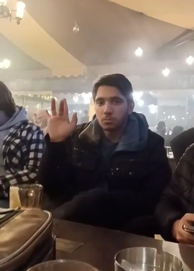 A young man sits at a table in what appears to be an indoor smoking area or cafe, possibly a hookah lounge, given the ambient haze