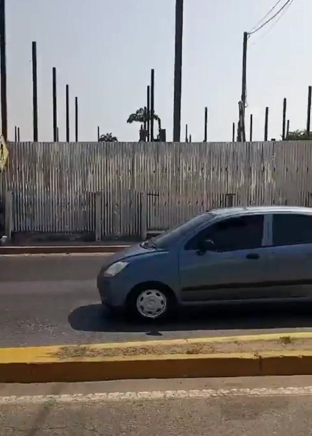 street scene taken from a moving vehicle. On the right side of the street, there's a gray metal fence, and beyond that, there are tall, dark vertical beams and some trees. The sky is bright and clear. In the first few frames, three people, possibly teenagers, are seen standing near the fence before they move out of view. A red car drives by on the street. The road has yellow painted edges. The camera continues to move, showing more of the metal fence and the vertical beams beyond it. A green bush comes into view on the left side of the road as the vehicle continues.