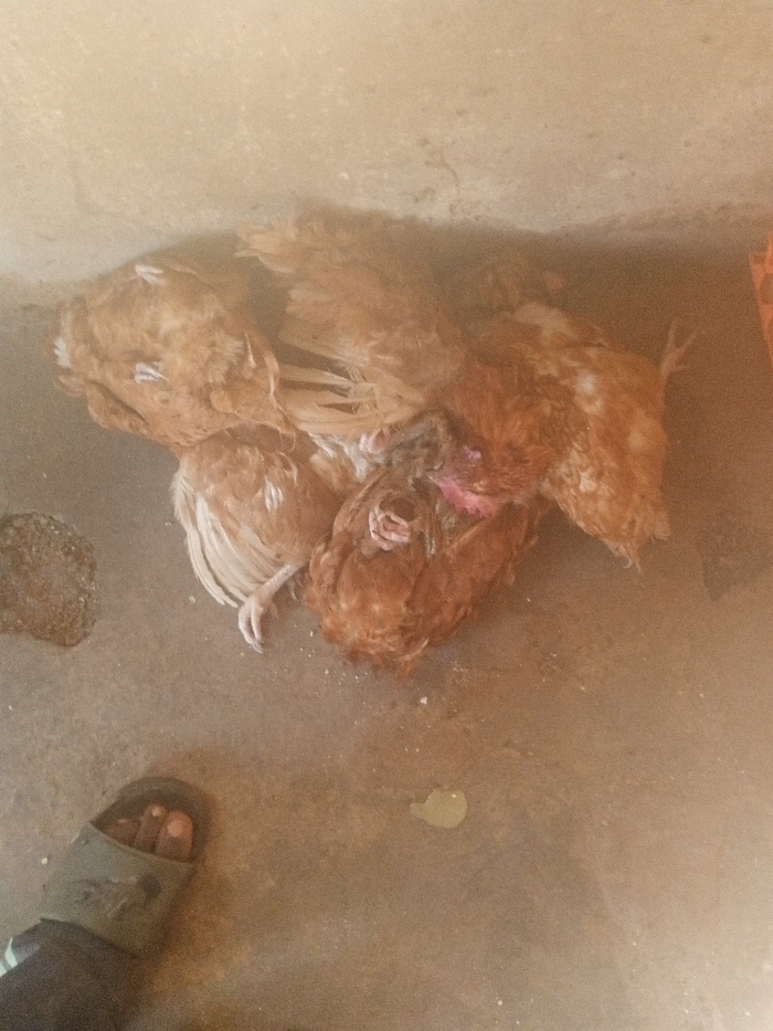 The image displays a cluster of at least five deceased brown-feathered chickens resting on a light-colored concrete floor