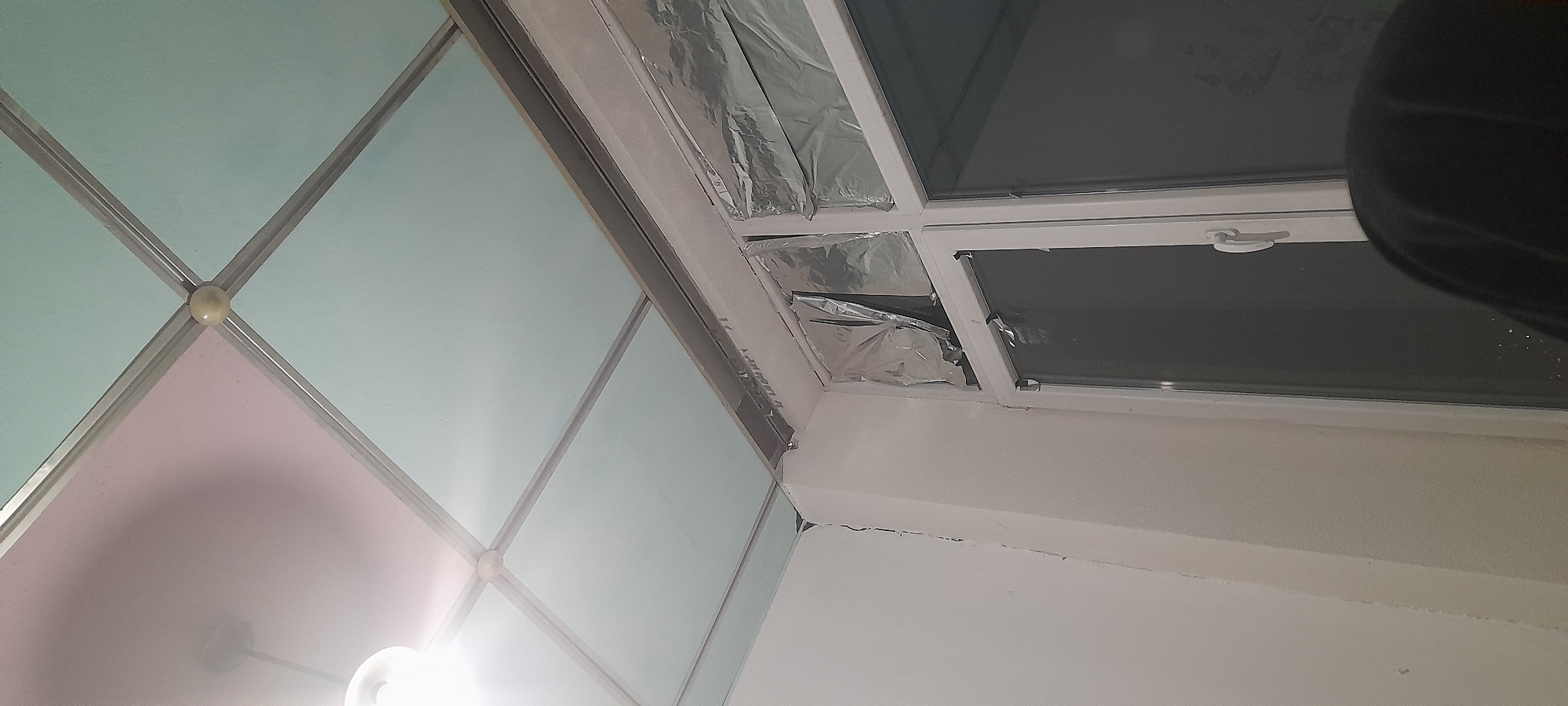 The image depicts an indoor scene in Sofia, Bulgaria, captured from a low angle looking upwards towards a ceiling and a window. The ceiling is a suspended grid system with rectangular panels, some light pink and others light blue/green, held by aluminum-colored rails. A single bare light bulb hangs from the ceiling in the upper left quadrant. A white wall with a visible corner occupies the left side of the frame, showing a vertical crack descending from the ceiling along the corner. On the right, a white-framed window is present, divided into multiple panes. The upper sections of the window are covered with crinkled aluminum foil, partially detached, appearing to block light. The lower window panes are dark, possibly tinted or reflecting the room's interior. A white handle is visible on the right-side window frame. A dark, indeterminate fabric or clothing item is partially visible in the lower right foreground. No individuals are explicitly seen engaging in actions.