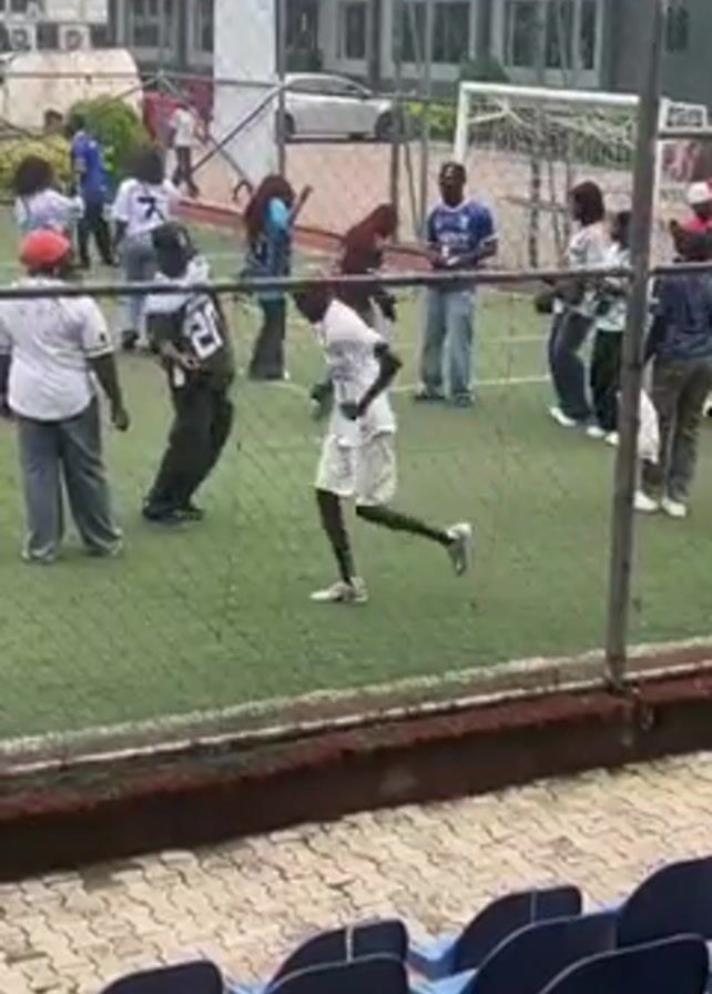 group of people on a green sports field, visible through a chain-link fence. Some individuals are moving or walking around, while others are standing in small groups. Most of the people are casually dressed. A soccer goal is visible in the background. A building with a green roof and light-colored walls is also in the background. The foreground features blue stadium seats with yellow trim.