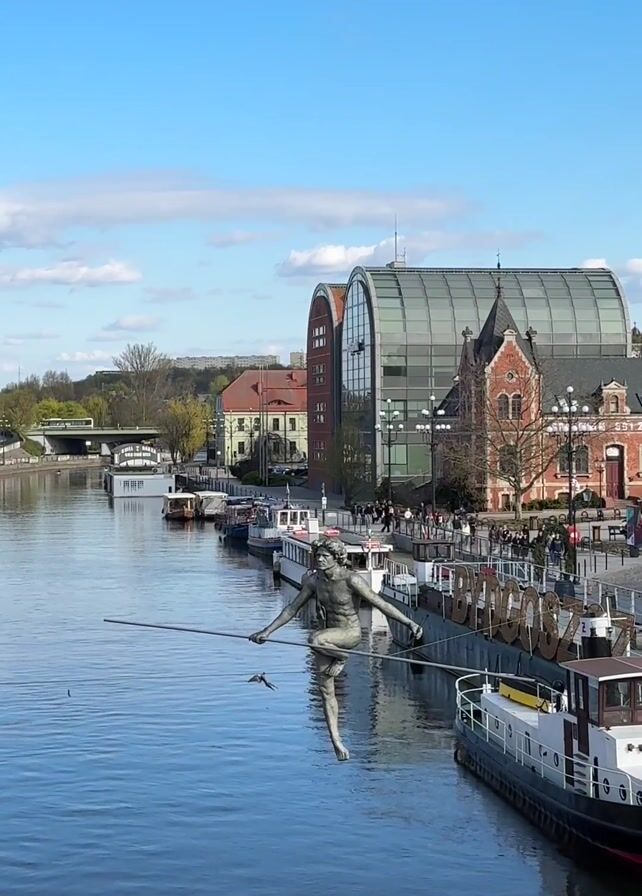 sculpture of a man balancing on a tightrope across a river. The sculpture is silver in color and positioned on the river with one foot hovering slightly above the water. The river reflects the clear blue sky with scattered clouds. In the background, there's a view of a city with various buildings, including a structure with a glass roof. Alongside the river, there is a paved walkway where people are strolling, and several boats are docked along the bank. The camera angle is slightly elevated, providing a wide view of the scene. The light is bright, suggesting it is daytime.