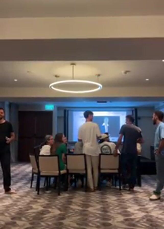A group of about a dozen people, mostly men, are gathered around a table in a conference room, watching a presentation on a projector screen. A man in black is walking towards the table, holding a glass of what appears to be wine. The room is well-lit with modern circular chandeliers. The floor is covered with a patterned carpet. Some people are seated at the table while others are standing.
