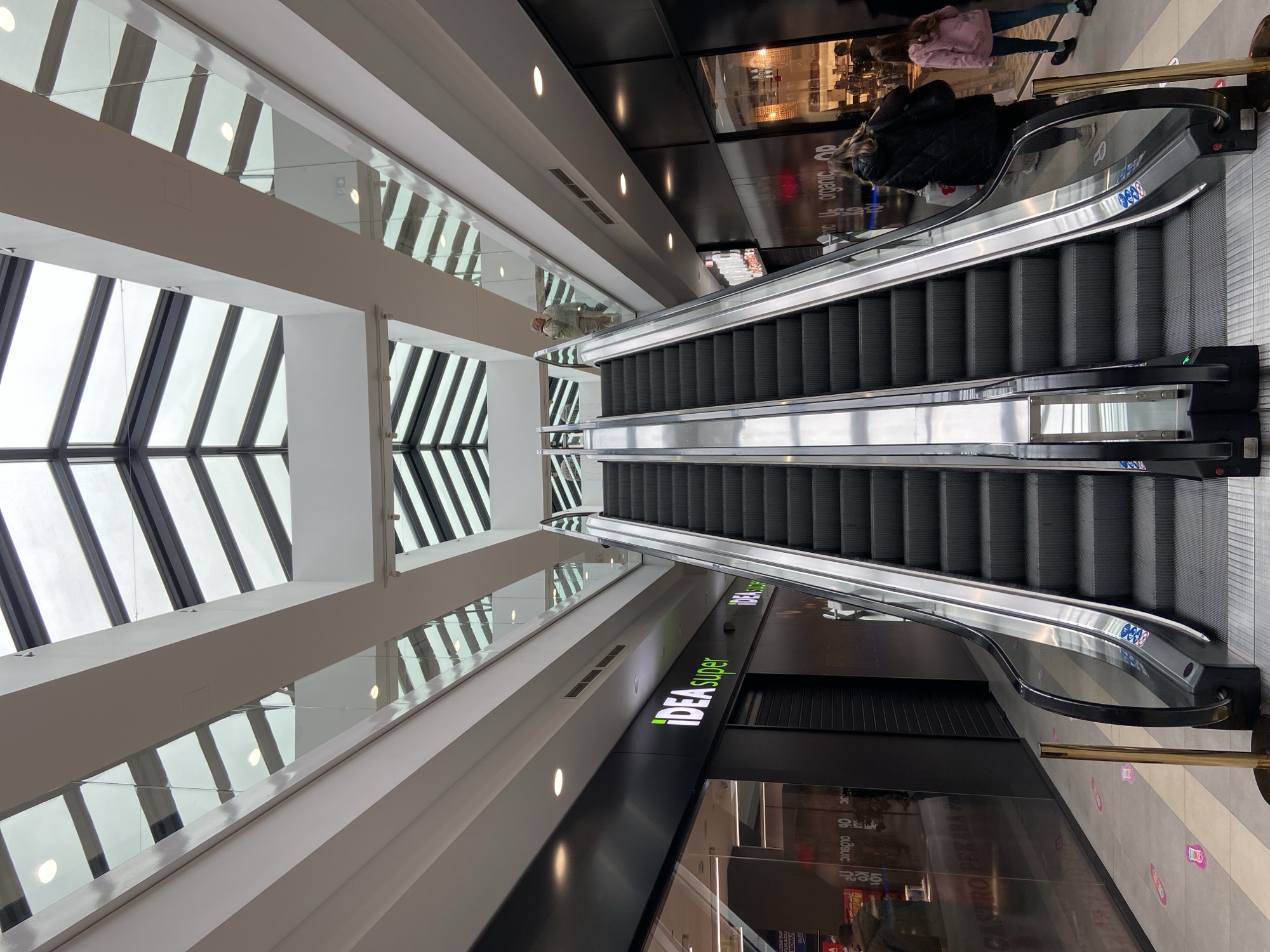 This image depicts the interior of a multi-level modern shopping mall. The specified location in the city of Dub, Montenegro, cannot be verified from the visual information presented. The scene is dominated by two parallel escalators ascending towards upper levels, positioned centrally within a wide, open atrium. The escalators feature dark grey steps, stainless steel handrails, and glass side panels. Overhead, a large skylight system composed of geometric glass panels and white structural beams allows natural light to enter. Additional recessed circular lights are visible on the white ceilings and along the fascias of the upper levels. On the left side of the escalators, a storefront with a dark, possibly black, facade is visible. A prominent illuminated sign in white and green text reads "IDEA super". A black roller shutter covers a section of the store. Further left, glass storefronts reflect interior lighting and blurred signage, including text appearing to read "GASTRO PEKARA". On the light-colored tiled floor near the base of the left escalator, several pink and purple footprint markers, indicating social distancing, are visible. A brass-colored stanchion stands near the escalator base. On the right side of the escalators, another dark-colored storefront is present. Its glass windows reflect interior spaces and some illuminated text, including "organic". Two individuals are walking away from the viewer on the right side of the escalators. The first individual, closer to the camera, wears a black jacket and has long dark hair. Ahead of them is a second, younger individual wearing a pink top and blue jeans. On the upper level, visible above the right escalator, an individual wearing light-colored, possibly beige, clothing (jacket and trousers) stands by a glass railing, looking towards the left. The mall's interior design is clean and contemporary, utilizing white walls, glass barriers, and polished surfaces.