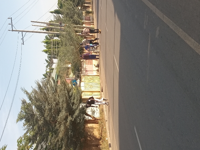 The image displays a daylight street scene in Hanwa, Nigeria, featuring a paved road with white lane markings. In the left foreground, a male individual wearing a black shirt and white trousers is rollerblading, moving towards the camera. Further along the right side of the road, a group of five other male individuals is present. One male, dressed in a dark blue garment, stands next to a dark motorcycle. Another male, wearing a blue top, is positioned near the motorcycle. Two additional males, one in a patterned light shirt and another in a plaid shirt, are walking away from the motorcycle towards the right side of the frame. A fifth individual from this group is partially obscured. The right side of the road is bordered by a concrete curb, an unpaved shoulder, and properties enclosed by walls, including a prominent yellow metal gate and buildings partially hidden by dense trees. Multiple utility poles with overhead power lines are visible along the right side. Abundant green trees and foliage line both sides of the street, under a clear sky.