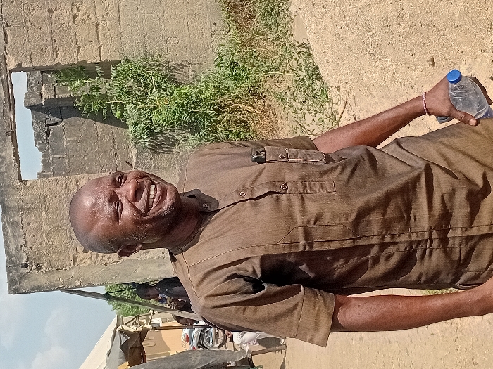 A middle-aged man smiles broadly, holding a water bottle. He wears a brown button-down shirt with short sleeves. His head is bald. The background includes a partially ruined building made of blocks, with vegetation growing nearby. In the distance, there are blurred figures and a vehicle beneath a makeshift canopy. The scene appears to be outdoors, possibly in a rural or underdeveloped area.