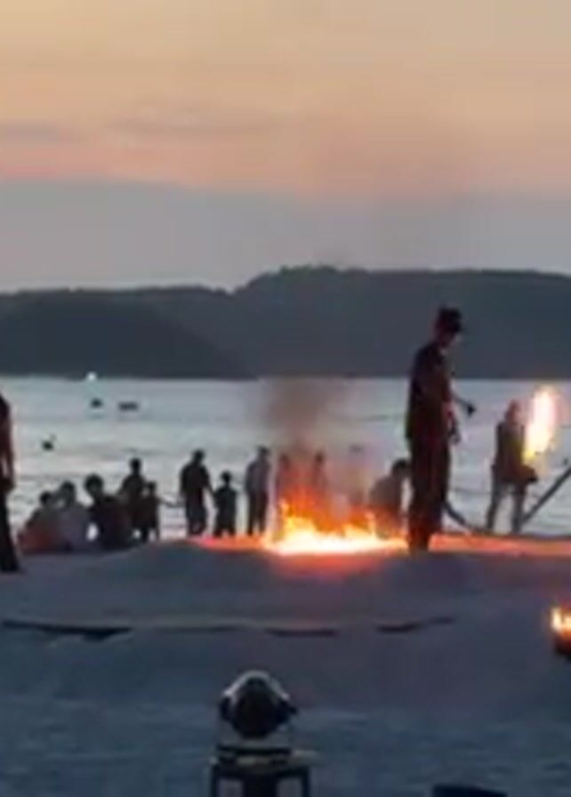 A crowd of people stands on a sandy beach, watching a fire performance. Two performers are manipulating flaming torches, one near a large bonfire in the center. The fire performance area is bordered by sand mounds. In the background is the sea with islands silhouetted against the dusky sky. Other lit torches are also placed around the performance area. A small piece of equipment sits near the bottom left corner of the frame.
