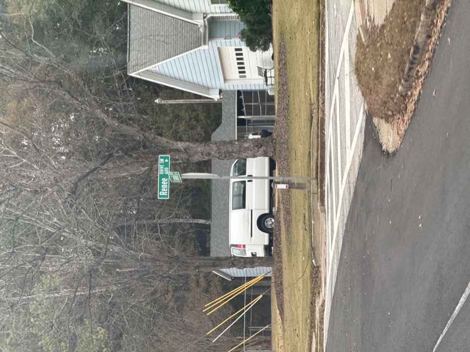 A street scene shows a green street sign reading "Renee" and "Drive SW" with the number 600. A white work van is parked next to the sign, partially obscured by a tree trunk. Behind the van, a house is visible with a light blue exterior and a garage. A crosswalk marked with white stripes is in the foreground. The surrounding area includes trees, grass, and fallen leaves.