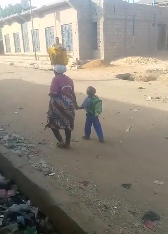 A woman carrying a yellow container on her head is walking hand-in-hand with a young child wearing a green backpack