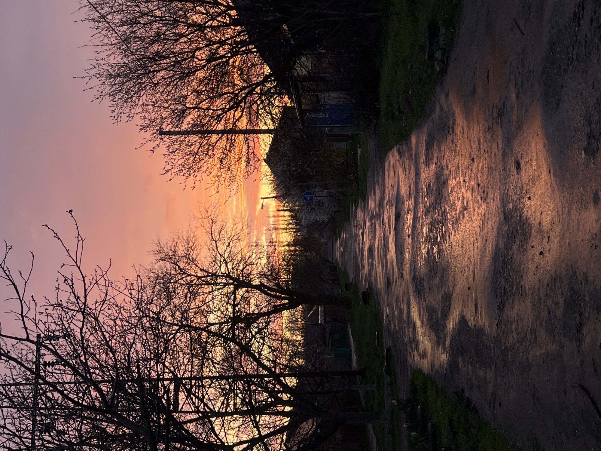 The image depicts a street scene at sunset in Beryozovy, Russia. The photograph is rotated, presenting the horizon vertically. Silhouetted trees with bare branches frame the sunset in a spectrum of orange and pink hues. A wet, unpaved road reflects the sunset light, running along the right side of the frame. Alongside the road, there is green grass. Houses and other buildings are visible between the trees. A round blue road sign is located near one of the buildings.