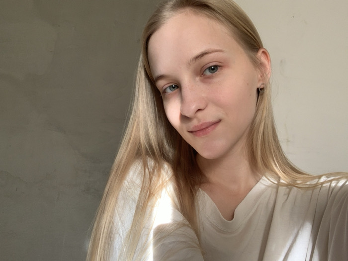 The image displays a close-up portrait of a young, light-skinned female with long, straight, blonde hair cascading over her shoulders