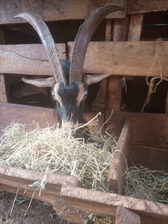 A goat is depicted in a wooden enclosure, at an unknown city and country location